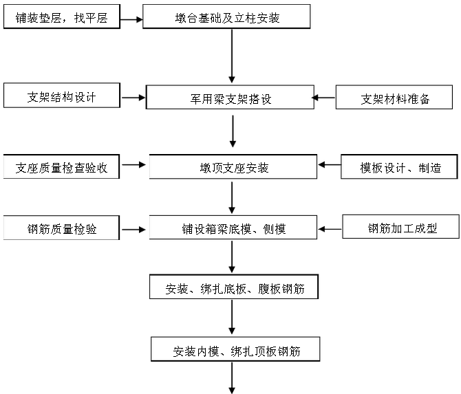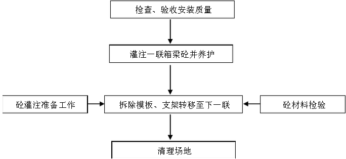 支架搭設→支座安裝→底模安裝→測量放線→調整底模標高→鋼筋安裝→內、外模安裝→頂板鋼筋安裝→檢查、簽證→澆筑混凝土→養(yǎng)護→拆模