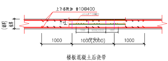 1)后澆帶的留置位置應(yīng)按圖紙和設(shè)計(jì)要求確定。后澆帶部位的構(gòu)件鋼筋不截?cái)啵以鲈O(shè)不少于 原配鋼筋15%的附加鋼筋,伸入后澆帶兩邊各1000mm,具體作法見下圖: