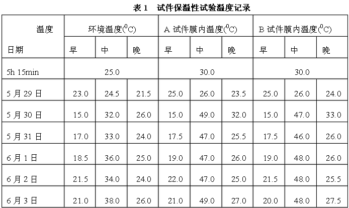 要求:用溫度計(jì)每天3次同時(shí)間內(nèi)測(cè)環(huán)境溫度(即膜外溫度)及養(yǎng)護(hù)膜內(nèi)溫度,記錄數(shù)據(jù),首次測(cè)試時(shí)間在混凝土試件初凝后并覆蓋養(yǎng)護(hù)膜5h,將溫度計(jì)放在養(yǎng)護(hù)膜與混凝土之間,測(cè)試15min時(shí)膜內(nèi)溫度與環(huán)境溫度。首次測(cè)試膜內(nèi)的溫度計(jì)要留在膜內(nèi)并便于養(yǎng)護(hù)期內(nèi)讀數(shù)。見(jiàn)表1、表2