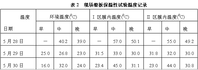 根據(jù)表1可以看出A 試件與B試件膜內(nèi)溫度較環(huán)境溫度均有所增高,說(shuō)明養(yǎng)護(hù)膜有一定的保溫作用,膜內(nèi)溫度隨環(huán)境溫度增高而增高,環(huán)境溫度較低時(shí),保溫效果較差。當(dāng)環(huán)境溫度低于150C時(shí),保溫效果為0。表2是現(xiàn)場(chǎng)整板測(cè)量數(shù)據(jù),環(huán)境溫度基本一至?xí)r,膜內(nèi)溫度要比試件測(cè)量值高得多,當(dāng)環(huán)境溫度為160C時(shí),膜內(nèi)溫度仍能達(dá)到230C,這是由于混凝土整板的水化放熱量要比試件大得多原因年造成。總體來(lái)看,養(yǎng)護(hù)膜保溫效果隨環(huán)境溫度的降低和齡期的延長(zhǎng)會(huì)逐漸減弱。