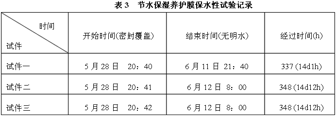 要求:制作150*150混凝土試件,在試件表面不見(jiàn)浮水,且達(dá)初凝后,先灑一次水,將200*200的養(yǎng)護(hù)芯膜平整覆蓋其上表面,并均勻?yàn)⑺敝琉B(yǎng)護(hù)膜鼓起3.0-5.0mm高,然后再蓋上面膜,并將養(yǎng)護(hù)膜同試件上表面邊緣密封好。開(kāi)始記錄時(shí)間至試件上表面無(wú)明水時(shí),膜內(nèi)相對(duì)濕度小于80%或無(wú)水氣時(shí),記錄時(shí)間。計(jì)算從開(kāi)始到結(jié)束所需時(shí)間h。見(jiàn)表3