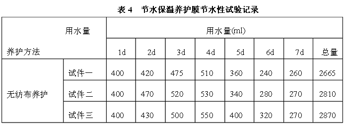從表4可看出用無(wú)紡布覆蓋養(yǎng)護(hù)的7d平均用水量為養(yǎng)護(hù)膜的近14倍,節(jié)水效果相當(dāng)明顯。在嚴(yán)重缺水地區(qū)使用是很有意義的,此外對(duì)節(jié)能環(huán)保也有好處。