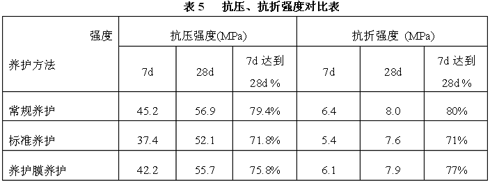 要求:同配合比、同批原材料的混凝土室內(nèi)成型150*150抗壓試件共6組,每種養(yǎng)護(hù)各2組, 150*150*550抗折試件共6組每種養(yǎng)護(hù)各2組,分別通過(guò)常規(guī)(無(wú)紡布灑水)養(yǎng)護(hù)、標(biāo)準(zhǔn)養(yǎng)護(hù)、養(yǎng)護(hù)膜養(yǎng)護(hù)后進(jìn)行7d、28d抗壓、抗折強(qiáng)度對(duì)比。見(jiàn)表5