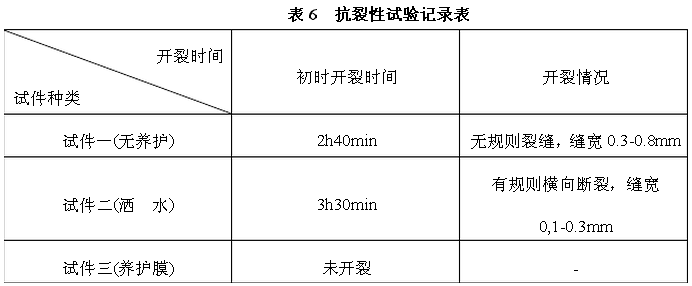 要求:按水灰比0.35制作水泥凈漿,制作厚度2cm,約20*20cm三個(gè)試件,室外自然條件下靜置,第一個(gè)試件無(wú)需任何養(yǎng)護(hù),第二個(gè)試件灑水養(yǎng)護(hù),第三個(gè)試件用養(yǎng)護(hù)膜密封養(yǎng)護(hù),觀察試件開(kāi)裂時(shí)間,精確到min。見(jiàn)表6