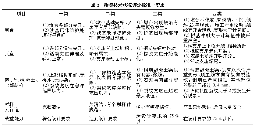 我國(guó)《公路橋涵設(shè)計(jì)規(guī)范》對(duì)運(yùn)營(yíng)橋梁技術(shù)狀況 評(píng)定制定了一個(gè)定性標(biāo)準(zhǔn),見(jiàn)表2。