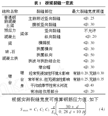 (2)根據(jù)裂縫檢查確定橋梁養(yǎng)護(hù)方案,凡裂縫超過(guò)表1橋梁裂縫限者一覽表時(shí),必須進(jìn)行加固處理,但有時(shí)裂縫寬度雖在允許范圍內(nèi),但存在下列情況之一的:①裂縫發(fā)展較快,6個(gè)月增大0.1mm以上;②裂縫數(shù)量顯著增加;③除裂縫外,還存在有其它嚴(yán)重缺陷,以上均需進(jìn)行加固處理。
