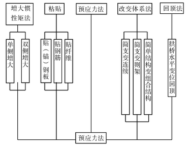 其次,確定以下幾種常用的橋梁加固方法,供確定橋梁加固方案時(shí)參考應(yīng)用。即①增大截面慣性矩法;②粘貼法;③預(yù)應(yīng)力法;④改變體系法;⑤回頂法;⑥綜合法等如圖3所示。