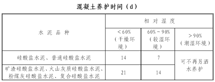 日平均氣溫不低于5℃時(shí),混凝土潮濕養(yǎng)護(hù)時(shí)間按下表執(zhí)行;日平均氣溫低于5℃時(shí),禁止對(duì)混凝土表面進(jìn)行灑水養(yǎng)護(hù),采用噴涂養(yǎng)護(hù)液的方式進(jìn)行養(yǎng)護(hù)。