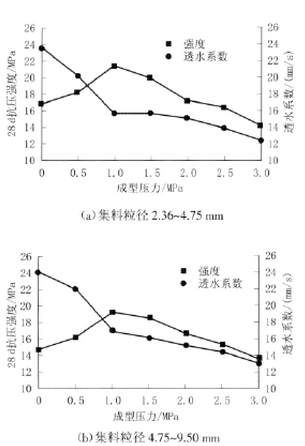 由圖2可見,隨著成型壓力的增大,透水混凝土逐漸密實(shí),孔隙率降低,其透水系數(shù)逐漸減小。在一定的壓力范圍內(nèi),透水混凝土的強(qiáng)度隨成型壓力的增大而提高,當(dāng)壓力增大到一定程度后,強(qiáng)度的變化比較平緩,這是因?yàn)榇藭r(shí)物料中的集料已緊密接觸,難以進(jìn)一步壓實(shí),再繼續(xù)增大成型壓力,就會(huì)導(dǎo)致集料的斷裂和破損,使透水混凝土強(qiáng)度降低。 這與透水混凝土壓制成型機(jī)理有密切關(guān)系,壓制成型是依靠強(qiáng)大的剪切力使物料顆粒相互錯(cuò)動(dòng)而達(dá)到密實(shí)的[3],在密實(shí)過程中,顆粒間的摩擦阻力逐漸增加,當(dāng)摩擦阻力與剪切力達(dá)到靜力平衡時(shí),透水混凝土就不能再進(jìn)一步密實(shí)。由于包裹集料的漿體層較薄,在壓制過程中透水混凝土集料顆粒間的摩擦阻力就變大或者說摩擦阻力增大的速度就加快,因而在達(dá)到靜力平衡時(shí)物料被壓縮的并不多。要達(dá)到更高的密實(shí)度,就必須繼續(xù)加大壓力,而這必然導(dǎo)致集料大范圍的破損,且試件上下密實(shí)程度不均勻,試件結(jié)構(gòu)上部密實(shí),下部相對(duì)疏松,這些都使透水混凝土的強(qiáng)度降低。