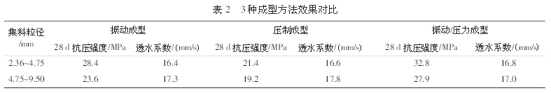 雖然上述的研究證實(shí)振動(dòng)成型和壓制成型均能使透水混凝土達(dá)到一定的密實(shí)度,強(qiáng)度得到一定程度的提高,但試驗(yàn)中發(fā)現(xiàn)這2種方法均存在一定的缺陷:振動(dòng)成型的試件底部比較密實(shí),而表面層集料在振動(dòng)時(shí)易于跳動(dòng),得不到充分密實(shí);壓制成型的試件表面比較密實(shí),試件下層沒有很好的密實(shí)而 易于存在大的空洞等缺陷,所以考慮研究一種兼?zhèn)湔駝?dòng)和壓力的成型方法。試驗(yàn)的配比、攪拌方式與前述相同,振動(dòng)成型 試驗(yàn)在振動(dòng)臺(tái)上振動(dòng)40s;壓制成型試驗(yàn)成型施加1.0MPa的壓力;振動(dòng)/壓力復(fù)合成型在振動(dòng)臺(tái)上振動(dòng)的同時(shí)施加0.6~0.8MPa的壓力,成型時(shí)間20~30s,標(biāo)準(zhǔn)條件養(yǎng)護(hù)。3種成型方法對(duì)透水混凝土性能的影響見表2。