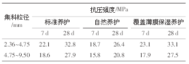透水混凝土與普通混凝土相比孔隙率要大的多,且多為 連續(xù)孔,新拌料成型后拌合水非常易于蒸發(fā)損失[4], 因此必須研究適當(dāng)?shù)酿B(yǎng)護(hù)方法來保證透水混凝土強(qiáng)度的正常發(fā)展。