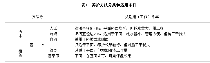 1)混凝土養(yǎng)護方法和適用條件詳見表1。