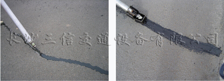 罐縫膠加熱至灌入溫度,用罐縫機(jī)上帶有刮平齊的壓力噴頭將罐縫膠均勻后灌入槽內(nèi),為保證罐縫膠溫度不降低,出料管道應(yīng)裝有加熱功能。可采用針式噴嘴灌縫,推薦采用小拖靴在裂縫兩側(cè)拖成5厘米的寬度的貼封層。每條裂縫的灌注工作應(yīng)該是連續(xù)的,如出現(xiàn)未完成填封的裂縫需要再次進(jìn)行填封處理。