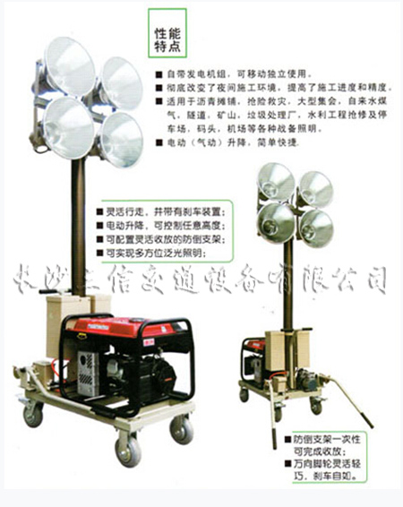 3、 適用于瀝青攤鋪,搶險救災(zāi),大型集會,自來水煤氣,隧道,礦山,垃圾處理廠,水利工程搶修及停車場,碼頭,機場等各種戰(zhàn)備照明。