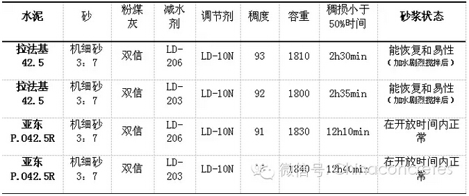 試驗(yàn)一選用了三組外加劑:路加A樣和B樣、浪淘砂LD-206和LD-10N、浪淘砂LD-203和LD-10N做為外加劑,探討對(duì)假凝現(xiàn)象對(duì)砂漿性能的影響。實(shí)驗(yàn)結(jié)果見表一: